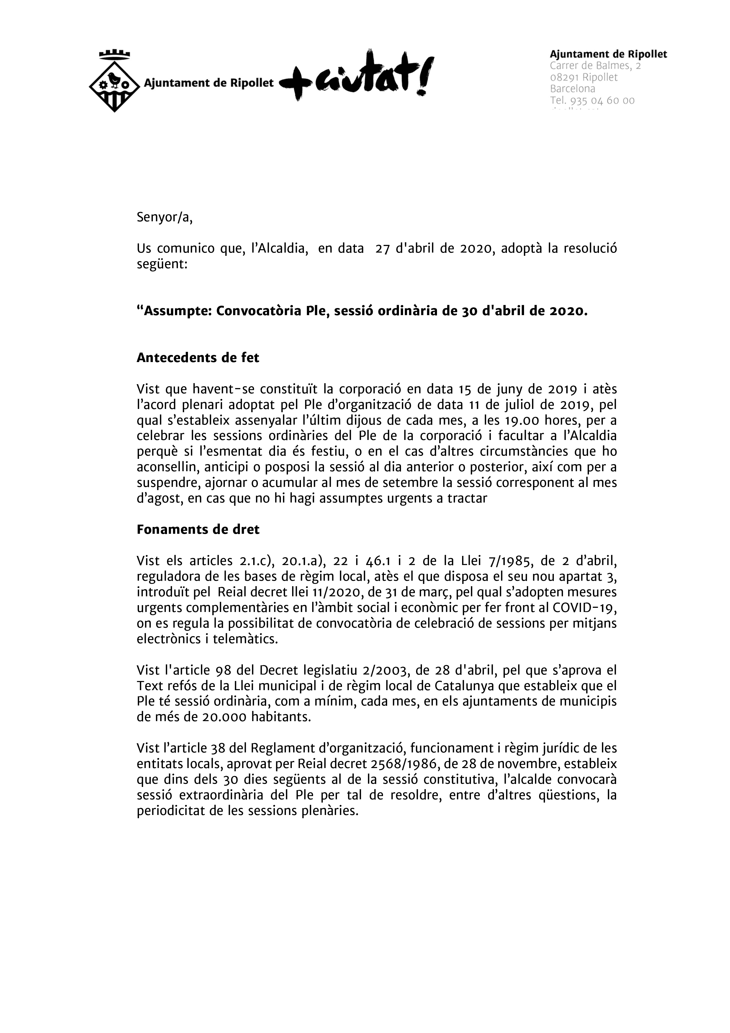 Seguiu el Ple ordinari del 30 d'abril de 2020 per internet