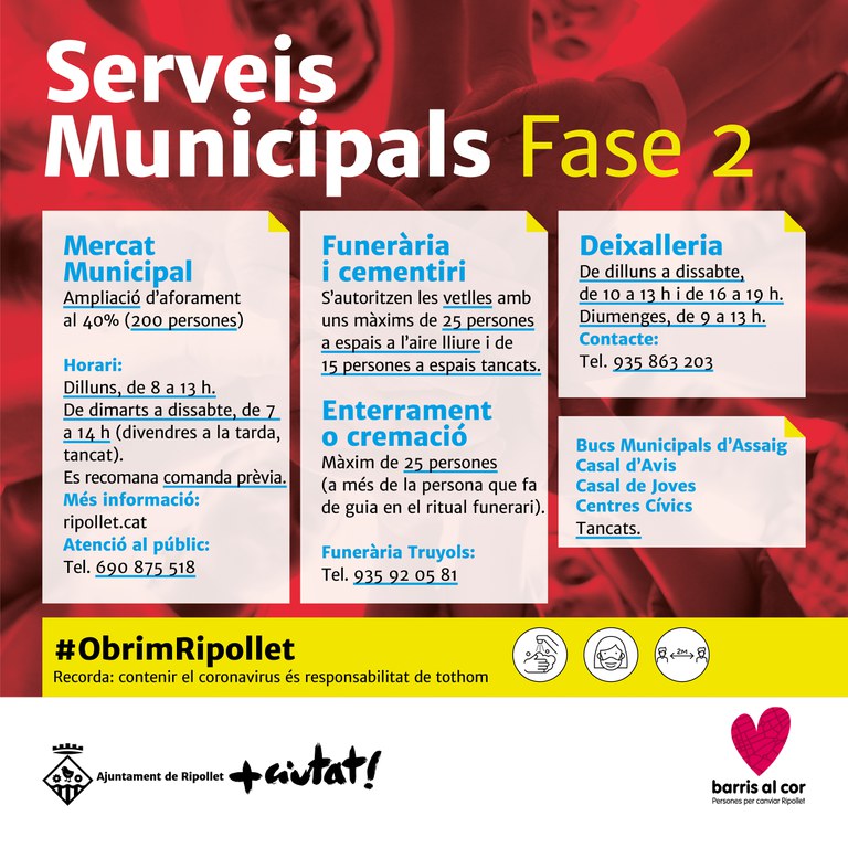 A banda de les novetats anunciades per l'Estat respecte a la mobilitat, la reunió amb familiars i amics i l'accés a bars i restaurants, a Ripollet, l'Ajuntament continua actualitzant i seguint el Pla de Restabliment de Serveis, que tot i l'obertura, segueix prioritzant l'accés als serveis municipals i l'atenció ciutadana de forma telefònica i telemàtica i apel·lant a la responsabilitat de la ciutadania. Amb l'etiqueta #ObrimRipollet, el consistori anirà informant novament de les noves mesures de la fase 2 de desescalada a les xarxes socials i a la web municipal ripollet.cat (consulteu imatges adjuntes).