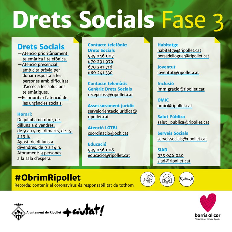 A banda de les novetats anunciades per l'Estat, entre les que destaca la llibertat de moviment dins la regió, l'eliminació de franges horàries i les reunions de fins a 20 persones, a Ripollet, l'Ajuntament ha continuat avançant i actualitzant el Pla de Restabliment de Serveis, que segueix prioritzant l'accés als serveis municipals i l'atenció ciutadana de forma telefònica i telemàtica i apel·lant a la responsabilitat de la ciutadania. Amb l'etiqueta #ObrimRipollet, el consistori torna a informar de les noves mesures de la fase 3 de desescalada a les xarxes socials i a la web municipal ripollet.cat (consulteu imatges adjuntes).
