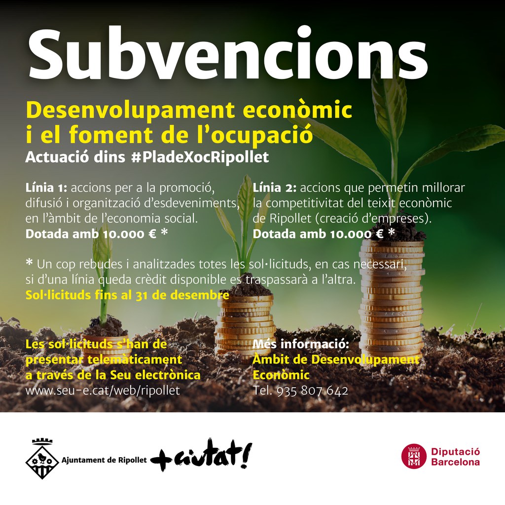 Les subvencions aprovades, en règim de concurrència competitiva, del Departament d'Empresa i Comerç de l'Ajuntament de Ripollet, són per ajudar a finançar accions per a la promoció, difusió i/o organització d'esdeveniments, en l'àmbit de l'economia social, i accions d'emprenedoria, que permetin millorar la competitivitat del teixit econòmic de Ripollet. Les sol·licituds es poden tramitar, electrònicament, des d'avui i fins al pròxim 30 de desembre.