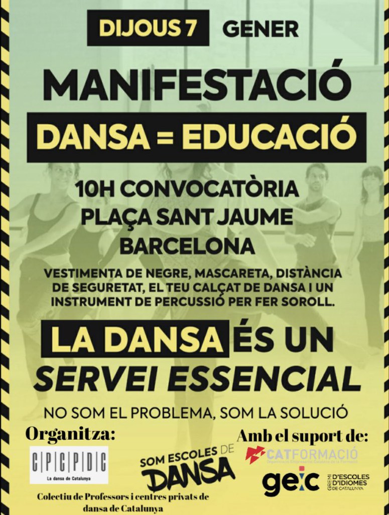 El col·lectiu d'escoles de dansa de Catalunya, entre elles les ripolletenques, van manifestar-se el dijous 7 de gener a Barcelona per reivindicar la seva reobertura (el vídeo es pot veure a aquest enllaç), després que les noves mesures contra la COVID-19 les obliguessin a tancar. El Col·lectiu de Professors i Centres Privats de Dansa de Catalunya reivindica, amb un comunicat que han fet arribar a la premsa, "que es reconegui" la seva activitat docent, que s'ha dut a terme "sempre sota unes mesures specífiques per al nostre sector, adequant els espais i centres, reduint l'aforament, reduint encara més un horari ja de per si precari i sense marge, sempre que així ens ho heu demanat i ha calgut, i on, sobre dades objectives, el risc de contagi ha estat de menys de l'1%". Reclamen també solucions i ajudes i també claredat en les normatives, que permeten l'obertura de comerços i generen en el sector de la dansa un sentiment de "discriminació i greuge comparatiu".