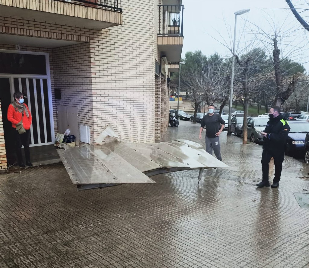 La Policia Local de Ripollet ha rebut aquest matí més d'una vintena de trucades per comunicar desperfectes o alertar sobre perills a la via pública provocades pel fort vent, com ara caiguda de cornises, voladissos, elements de les façanes i senyals de trànsit. També s'han rebut trucades per tanques bolcades i la caiguda de branques i arbres, com ara un a la plaça del Molí i un altre al carrer de Magallanes. A banda dels nombrosos danys materials, també s'ha hagut de traslladar al CUAP a una dona que ha caigut a causa del vent.