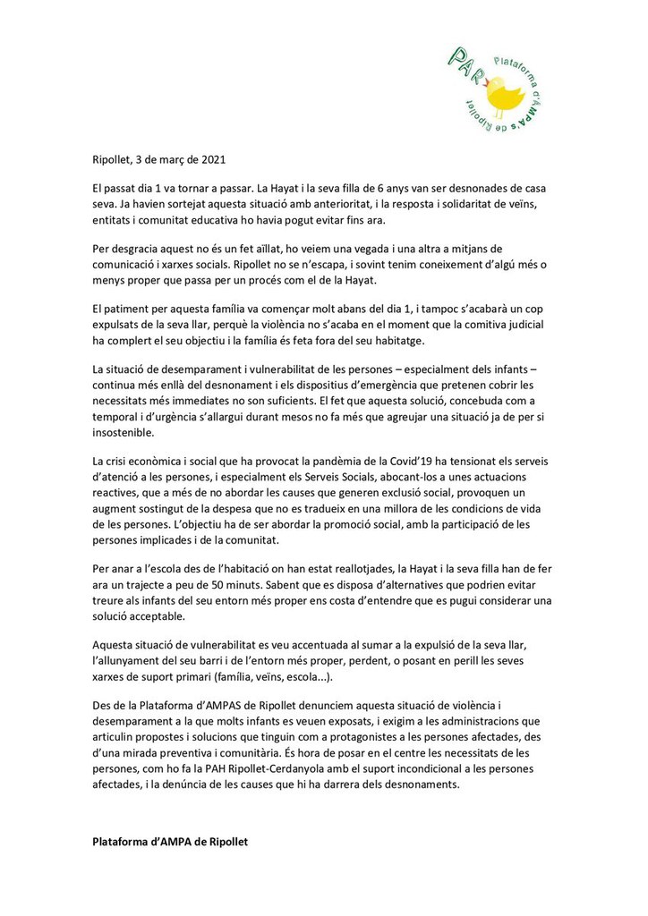 La Plataforma d'AMPA de Ripollet i l'AFI El Martinet han emès un comunicat, difós a través de les seves xarxes socials, en què es denuncia el desnonament que es va executar dilluns a Ripollet, quan es va fer fora de casa seva la Hayat i la seva filla de 6 anys, alumna de l'escola El Martinet. Al text denuncien que "la situació de desemparament i vulnerabilitat de les persones -especialment els infants- continua més enllà del desnonament i els dispositius d'emergència que pretenen cobrir les necessitats més immediates no són suficients". Afegeixen que "el fet que aquesta solució, concebuda com a temporal i d'urgència, s'allargui durant mesos no fa més que agreujar una situació ja de per si insostenible".