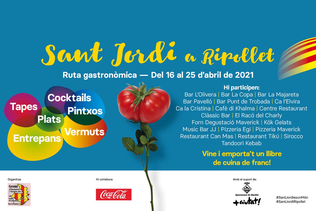 Sant Jordi a Ripollet ha donat el tret de sortida amb l'inici de la ruta gastronòmica organitzada pel Gremi d'Hostaleria. Un total de 20 establiments oferiran tapes, còctels, plats i entrepans elaborats amb productes típics de la gastronomia catalana des d'avui divendres i fins al diumenge 25 d'abril. A més, tots aquells clients que deixin algun escrit de Sant Jordi als llibres blancs que trobaran als bars i restaurants adherits, rebran un llibre de receptes de cuina saludable.
