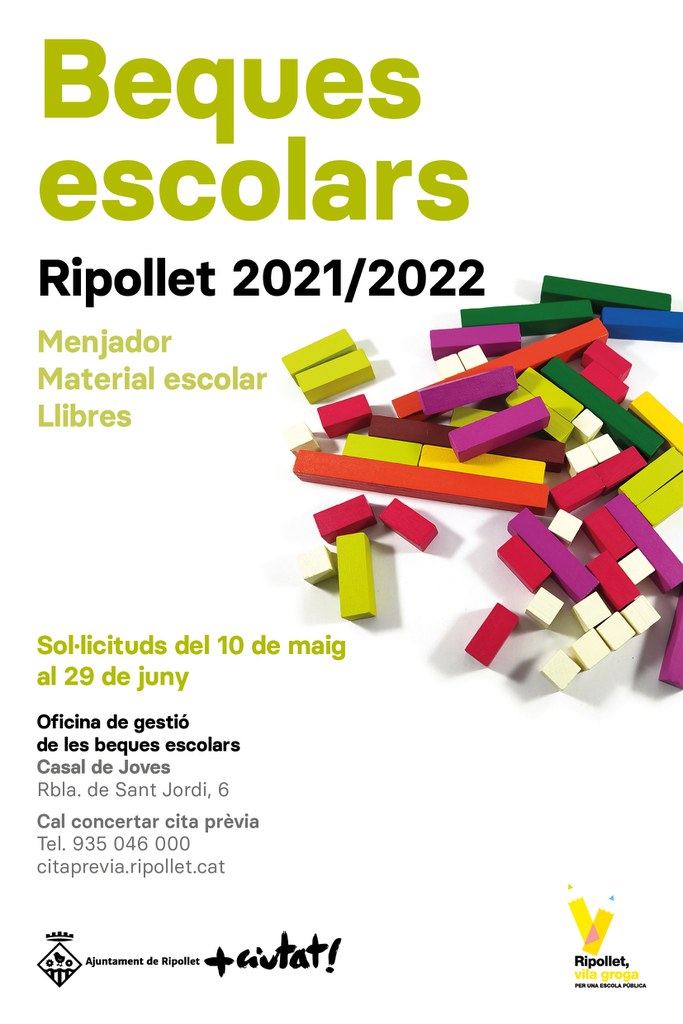 Des d'aquest dilluns, 10 de maig, i fins al 29 de juny de 2021, es poden tramitar les sol·licituds de beques escolars de menjador i de llibres i material escolar per al curs 2021-2022. Poden optar-hi les famílies dels alumnes empadronats a Ripollet que cursin de P3 a 4t d'ESO en un centre educatiu del Vallès Occidental. La presentació de sol·licituds es realitzarà de forma telemàtica o presencial, amb cita prèvia.
