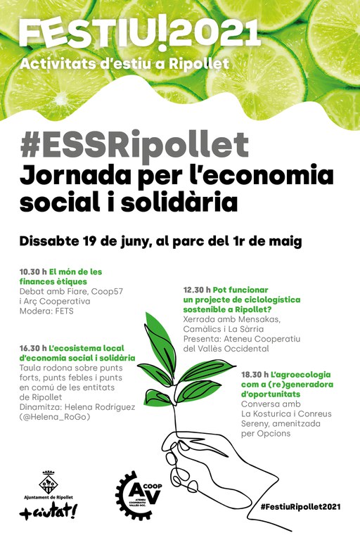 El pròxim dissabte, 19 de juny, el parc del 1r de maig acollirà una jornada per l'economia social i solidària, organitzada per l'Ajuntament de Ripollet, a través de l'àmbit de Desenvolupament Econòmic, amb la col·laboració de l'Ateneu Cooperatiu del Vallès Occidental. La jornada, que s'inclou a la programació del Festiu Ripollet, comptarà amb la participació d'una quinzena d'entitats del món del cooperativisme i l'ESS, per debatre i explicar les seves experiències en relació amb temes com les finances ètiques, la ciclologística sostenible, l'agroecologia o l'economia social i solidària a Ripollet.