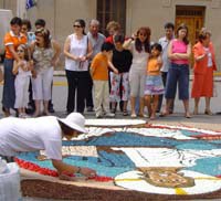 La pluja va impedir disfrutar durant tot el dia de les catifes de flors, malmentent un treball de moltes hores, que només van poder gaudir les persones que es van acostar als carrers del Nucli Antic pel matí. Els catifaires de l’Associació Cultura i Tradició i la parròquia de Sant Esteve havien estat treballant des de les 7 del matí i fins el migdia en els dissenys. El més elaborat va ser la imatge del Pantocrator de Sant Climent de Taüll, situada a la plaça Clos, amb la qual l’entitat havia obtingut el 4art premi el passat mes de maig al Concurs Internacional de Catifes de Flors de Fàbria (Itàlia). Destacar també la catifa realitzada per la Penya Barcelonista amb motiu del seu 30 aniversari.