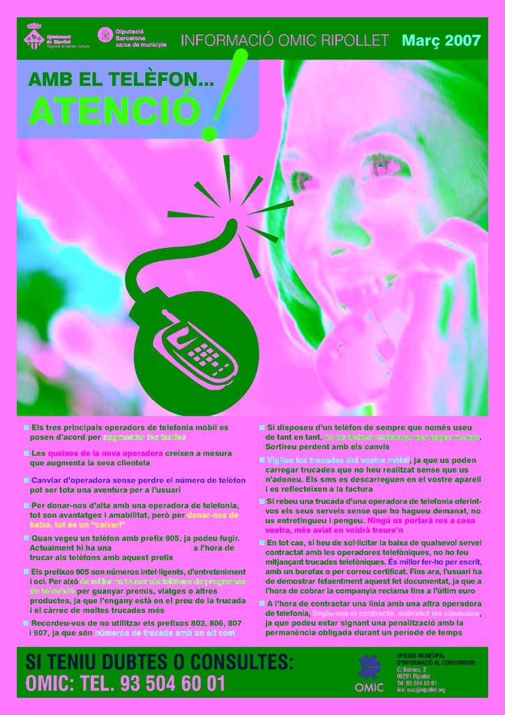 Amb motiu de la celebració del Dia Mundial del Consumidor, el 15 de març, l'Oficina Municipal d'Informació al Consumidor ha editat un díptic informatiu per alertar sobre els mals usos de la telefonia mòbil. El díptic, que s'ha distribuït en format bilingüe, alerta als usuaris sobre situacions habituals en les que es poden trobar per tal que les puguin evitar.