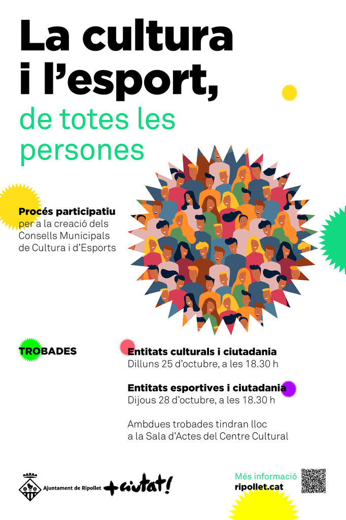 Aquest dilluns, 25 d’octubre, se celebra una sessió de treball adreçada a entitats culturals i a ciutadania en general. La trobada participativa començarà a les 18.30 h a la Sala d’Actes del Centre Cultural. Dijous, 28 d’octubre, serà el torn de les entitats esportives, també a la Sala d’Actes del Centre Cultural a la mateixa hora.