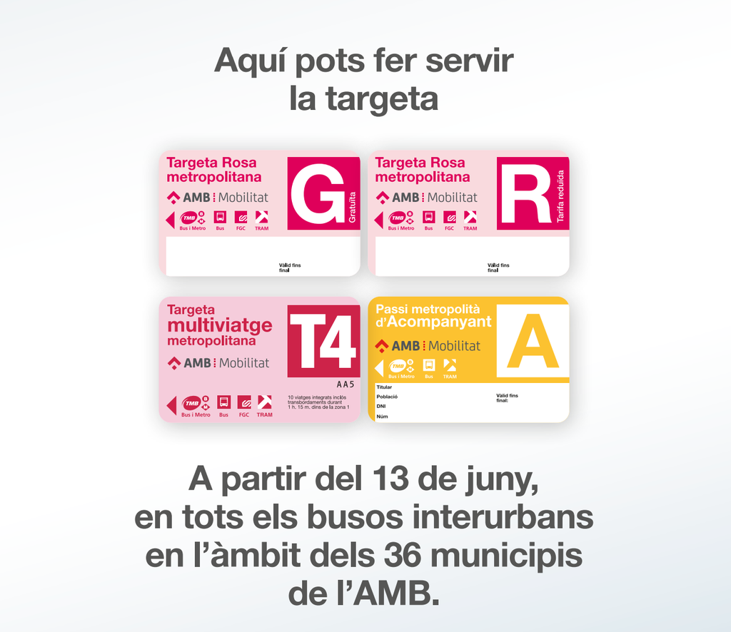 Des d’aquest dilluns, 13 de juny, l’AMB estendrà l’ús dels títols de tarifació social metropolitana, la Targeta Rosa, la Targeta Rosa reduïda (T4) i el Passi d’Acompanyant, al transport públic dels municipis de la segona corona metropolitana. Les persones usuàries de busos interurbans, FGC i serveis urbans de Ripollet, Cerdanyola, Barberà del Vallès, Castellbisbal, Torrelles de Llobregat i Corbera de Llobregat, ja podran fer servir els títols socials metropolitans, que faciliten l'accés als serveis de transport metropolitans a les persones grans o amb discapacitat i que disposen de pocs recursos econòmics.
