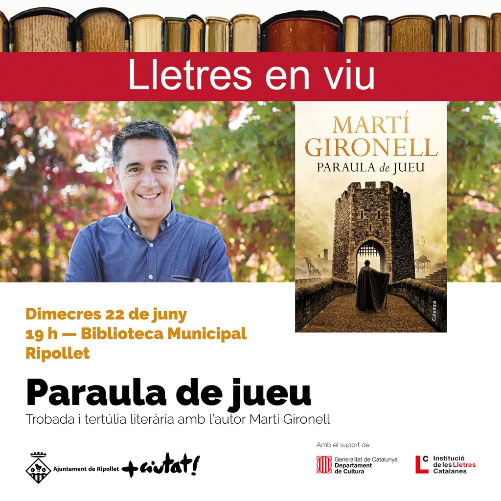 El periodista i escriptor Martí Gironell participa aquest dimecres, 22 de juny, en la darrera tertúlia literària dels clubs de lectura de la Biblioteca de Ripollet, centrada en la seva darrera novel·la Paraula de jueu. Aquesta activitat s'organitza amb el suport del programa "Lletres en Viu", impulsat per la Institució de les Lletres Catalanes. L'objectiu és afavorir el contacte entre els lectors i lectores i els autors i autores de literatura catalana, mitjançant la seva presència en les trobades als clubs de lectura d'adults que s'organitzen a les biblioteques públiques del país, com ara la Biblioteca de Ripollet.