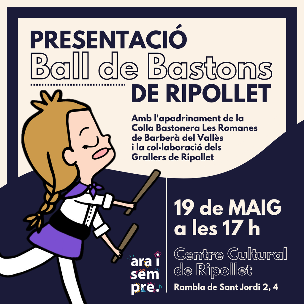 A l’acte, que comptarà amb la participació dels grallers dels Gegants de Ripollet, es presentaran les dues primeres peces de ball de bastons creades a Ripollet, amb músiques de la Coordinadora de Ball de Bastons de Catalunya, present a l’acte a través de la seva delegada al Vallès, Marta Rodríguez. La coordinadora també els ha cedit el vestuari que lluiran aquest dijous. El grup també ballarà altres peces cedides per la colla Les Romanes, qui l’ha convidat el pròxim diumenge a participar a La Bastonada del Vallès 2022, que tindrà lloc a Barberà del Vallès, amb la participació de 12 colles d’arreu de Catalunya, el que suposarà la seva presentació fora de Ripollet.
