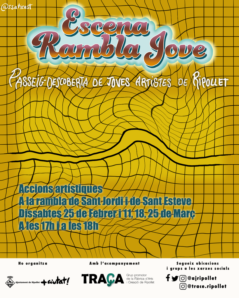 Entre les 17 i les 19 h, es presentaran dues propostes en dos punts diferents de les rambles, separades físicament per tal de convidar a passejar i gaudir de l'extensa oferta comercial del municipi. 'Escena Rambla Jove' està organitzat per l'Ajuntament de Ripollet, des de Ripollet Impulsa, amb el suport de Traça i la coordinació de l'Evelyn Sepúlveda.