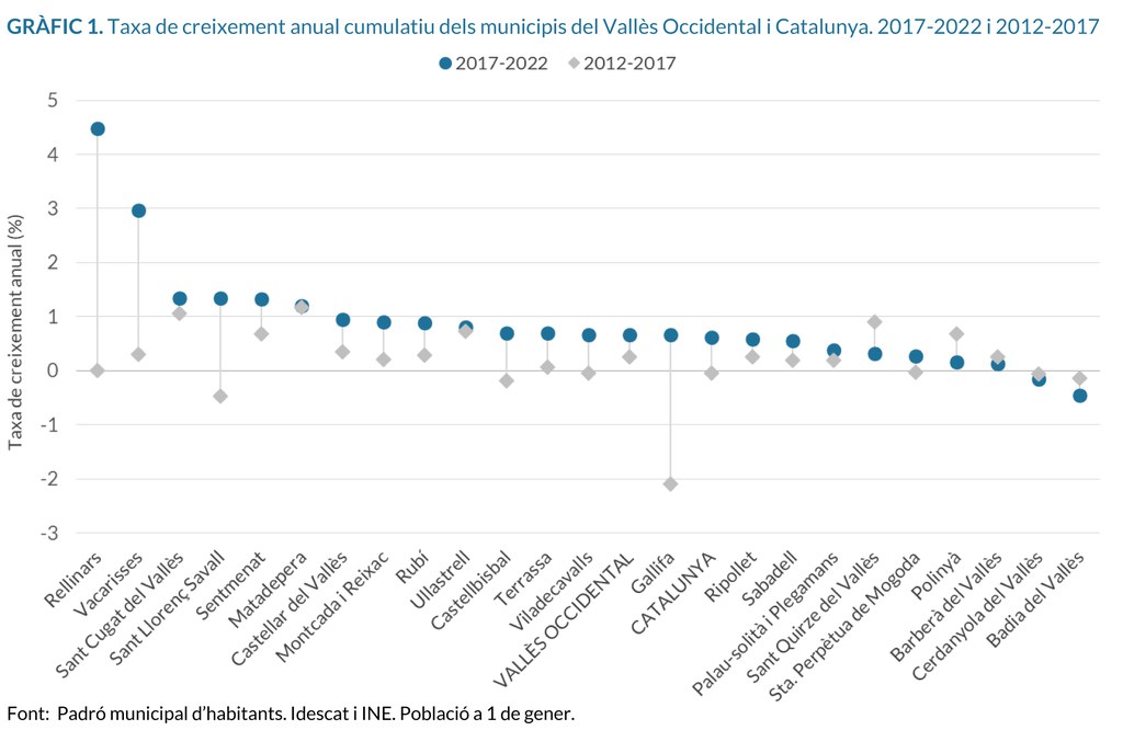 Ripollet és un dels 7 municipis del Vallès Occidental que perden població, amb un percentatge del -0,28%, com ha passat en altres ciutats grans de la comarca, com ara Sabadell (-0,21%), Santa Perpètua de Mogoda (-0,40%) o Montcada i Reixac (-0,35%). Malgrat aquesta pèrdua de població, la densitat poblacional a Ripollet es manté per sobre de la mitjana comarcal, que és de 1.613,5 hab./km2. En total, hi ha 9 municipis que tenen més densitat de població que la mitjana del Vallès Occidental. En destaquen, Badia del Vallès (14.153,8 hab./km2), seguit per Ripollet (9.014,1 hab./km2) i Sabadell (5.709,4 hab./km2).