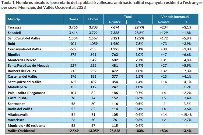 D'entre les dades publicades, destaca el fet que els vallesans residents a l'estranger han augmentat un 87% en els darrers deu anys, el que suposa 25.628 persones. Això es deu al fet que més de la meitat d'aquesta població són persones immigrades d'origen estranger, que van accedir a la nacionalitat espanyola i que han retornat al seu país d'origen, i descendents de l'emigració espanyola.