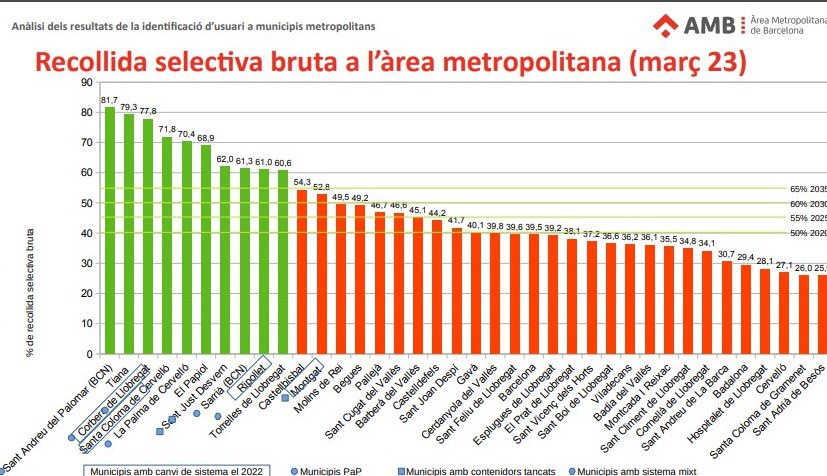 Dels 36 municipis metropolitans, el 2022 només vuit municipis superaven el 50% de recollida selectiva que la UE exigia per al 2020: Begues, Castellbisbal, Pallejà, el Papiol, Corbera de Llobregat, Sant Just Desvern, Torrelles de Llobregat i Tiana. En el cas de Ripollet, aquest percentatge s'enfilava fins al 46%, insuficient per arribar a les exigències europees.