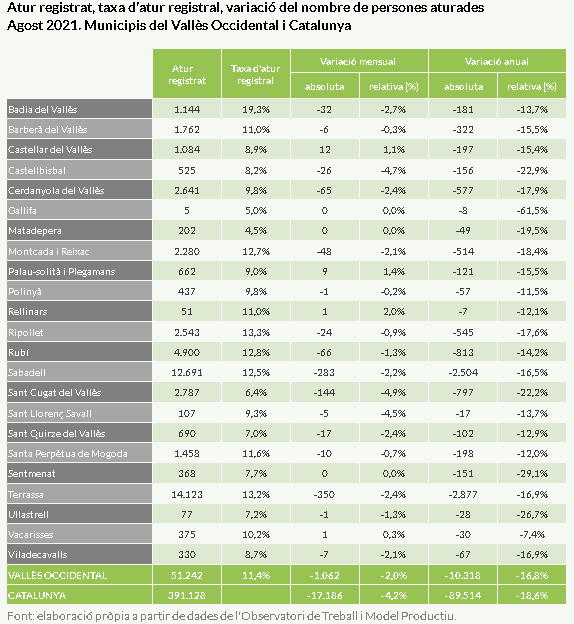 Segons fonts de l'Observatori del Consell Comarcal del Vallès Occidenta, a la comarca, el mes d'agost de 2021 finalitza amb 51.242 persones aturades. Respecte al juliol, l'atur disminueix un 2%, el que representa 1.062 persones desocupades menys a la comarca. La taxa d'atur registral provisional se situa en el 11,4%.