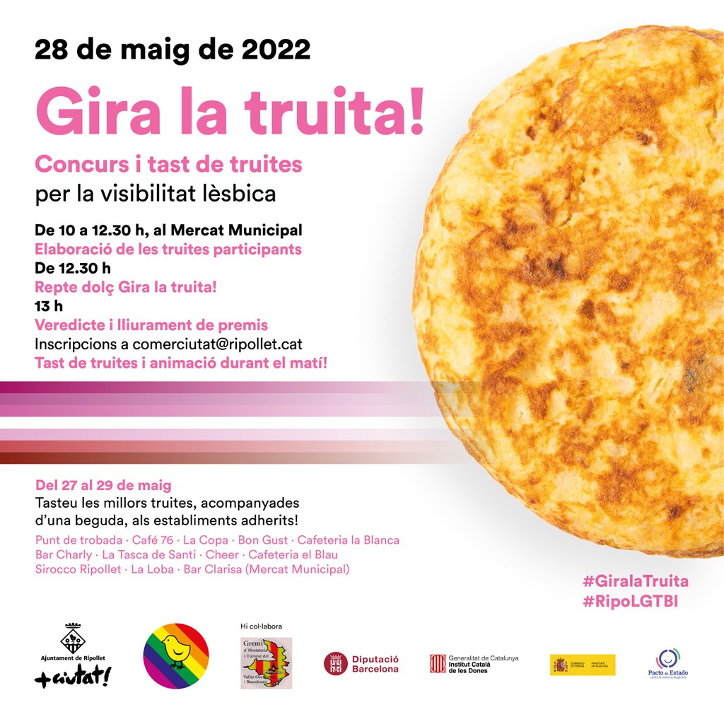 Amb motiu del Dia Internacional contra l'LGTBI-fòbia, que es va commemorar el 17 de maig, i per reivindicar la visibilitat lèsbica i el dret a la llibertat sexoafectiva, l'Ajuntament de Ripollet organitza aquest cap de setmana l'activitat Gira la truita! amb la col·laboració del Gremi d'Hostaleria del Vallès Occidental i el Barcelonès. Es tracta d'un concurs i tast de truites que tindrà lloc aquest dissabte, 28 de maig, al Mercat Municipal, a partir de les 10 h. Les persones que hi vulguin participar, han d'inscriure's al correu electrònic comerciutat@ripollet.cat. Entre totes les truites participants, es premiarà la més divertida, la que tingui l'ingredient més estrany i la millor clàssica de patates. A més, hi haurà animació al Mercat Municipal durant tot el matí i es donaran a degustar diferents truites entre els assistents, els quals també podran descobrir, a partir de les 12.30 h, quin ha estat el repte dolç del Gira la truita!