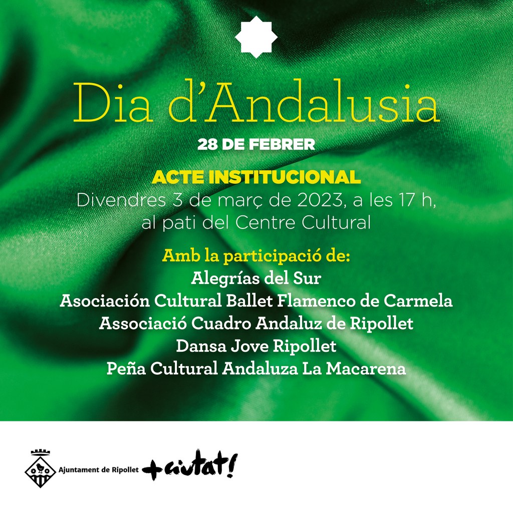 Aquest dimarts, 28 de febrer, es commemora el Dia d’Andalusia, en commemoració al mateix dia de l’any 1980, en el qual es va celebrar el referèndum sobre la iniciativa del procés autonòmic, que va donar autonomia plena a la comunitat andalusa. Ripollet se suma un any més a aquesta commemoració, amb un festival flamenc, que tindrà lloc aquest divendres, 3 de març, a partir de les 17 h, al pati del Centre Cultural.