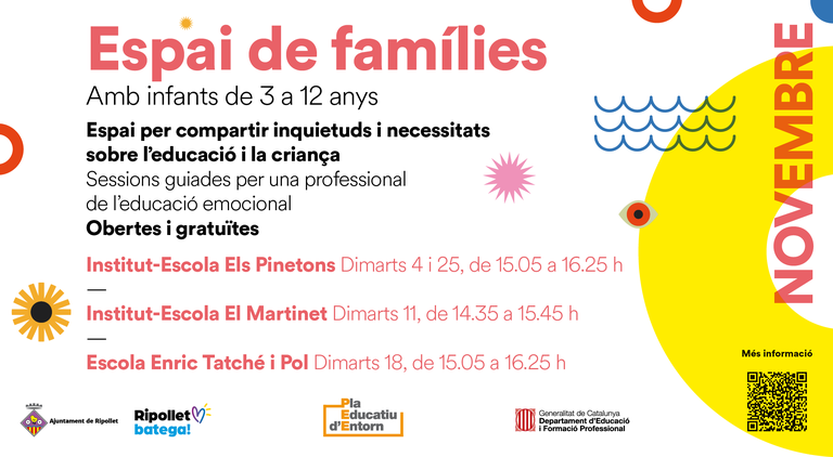 Espais de Famílies és una iniciativa gratuïta i oberta a tothom. És un punt de suport i acompanyament per a famílies, amb sessions que tindran lloc en diferents centres educatius de Ripollet, un dia a la setmana, en horari lectiu de tarda, de novembre a maig.