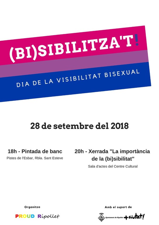 L'Ajuntament, a més, col·labora amb l'entitat Proud Ripollet, presentada el passat mes de juny al municipi, en l'organització de dues activitats que tindran lloc aquest divendres, 28 de setembre. Es tracta de la pintada d'un banc de les pistes de l'ESBAR, a les 18 h, amb els colors de la bandera Bisexual, que se sumarà als de la bandera LGTBI i la bandera Trans que ja hi ha pintats en aquest espai públic. A les 20 h, l'entitat oferirà una xerrada a la sala d'actes del Centre Cultural, sota el títol "La importància de la (bi)sibilitat".