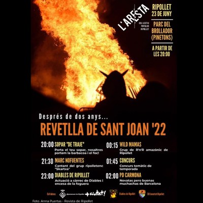 El Col·lectiu l’Aresta, al parc dels Pinetons, organitza una revetlla amb espai per sopar, espectacle de foc dels Diables i música en directe amb un concert i PD’s. El Centro Aragonés organitza un sopar de carmanyola per a la revetlla al carrer Nou, davant de la seva seu.